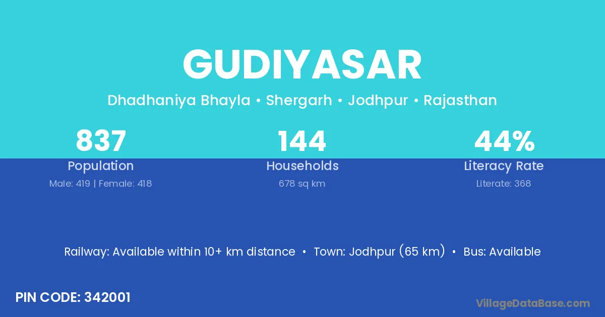 Jodhpur (65 km) is the nearest town to Gudiyasar village for major economic activities and is located approximately 65 km away.