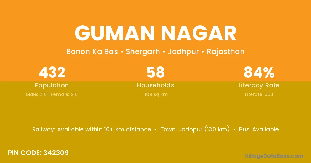 Jodhpur (130 km) is the nearest town to Guman Nagar village for major economic activities and is located approximately 130 km away.