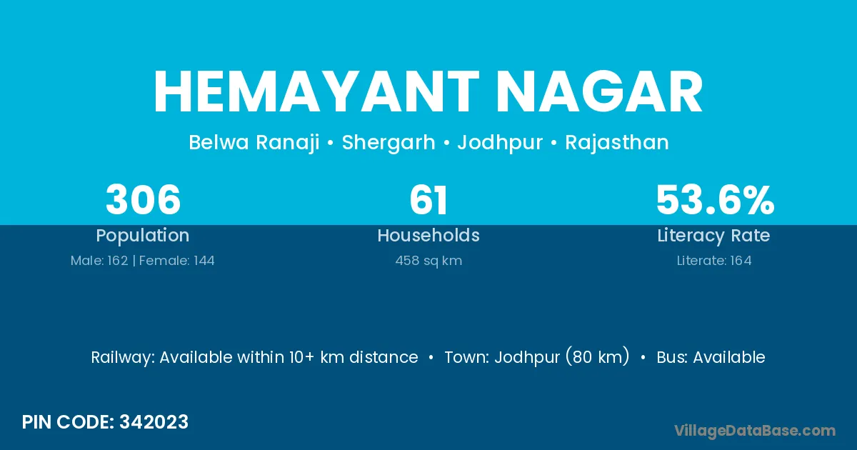 Jodhpur (80 km) is the nearest town to Hemayant Nagar village for major economic activities and is located approximately 80 km away.