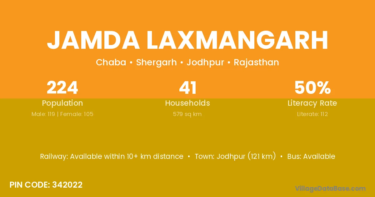 Jodhpur (121 km) is the nearest town to Jamda Laxmangarh village for major economic activities and is located approximately 121 km away.