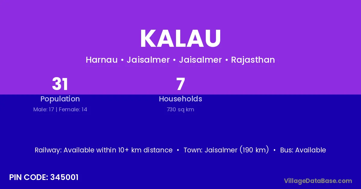 Jodhpur (137 km) is the nearest town to Kalau village for major economic activities and is located approximately 137 km away.