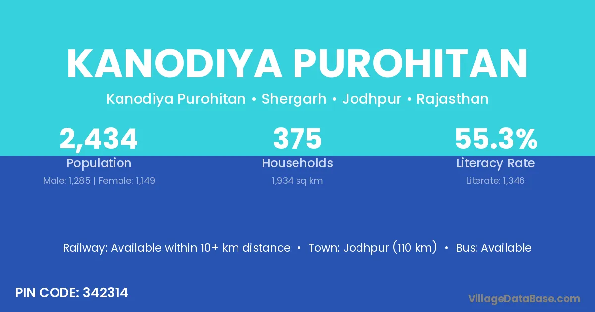 Jodhpur (110 km) is the nearest town to Kanodiya Purohitan village for major economic activities and is located approximately 110 km away.