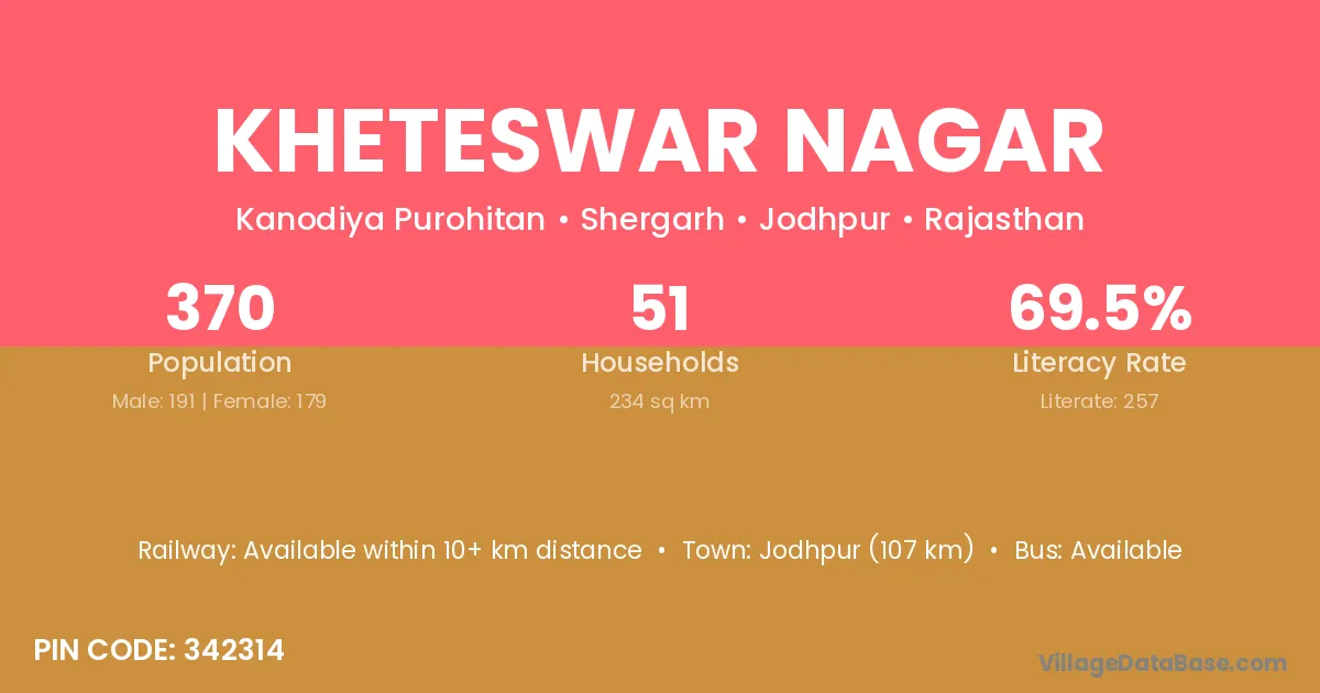 Jodhpur (107 km) is the nearest town to Kheteswar Nagar village for major economic activities and is located approximately 107 km away.