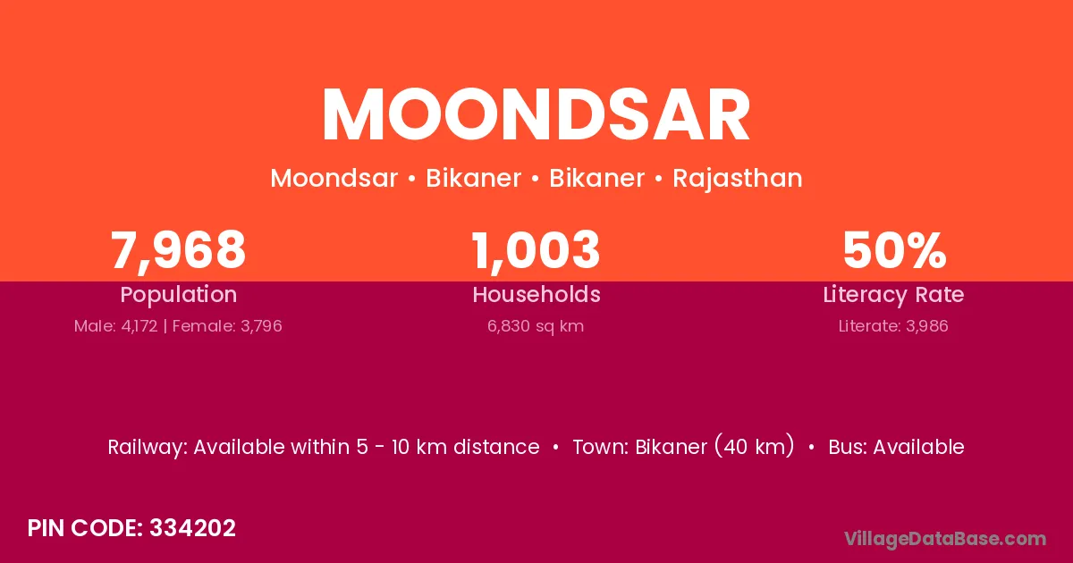 Jodhpur (42 km) is the nearest town to Moondsar village for major economic activities and is located approximately 42 km away.