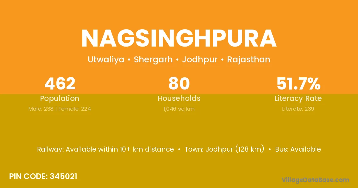 Jodhpur (128 km) is the nearest town to Nagsinghpura village for major economic activities and is located approximately 128 km away.