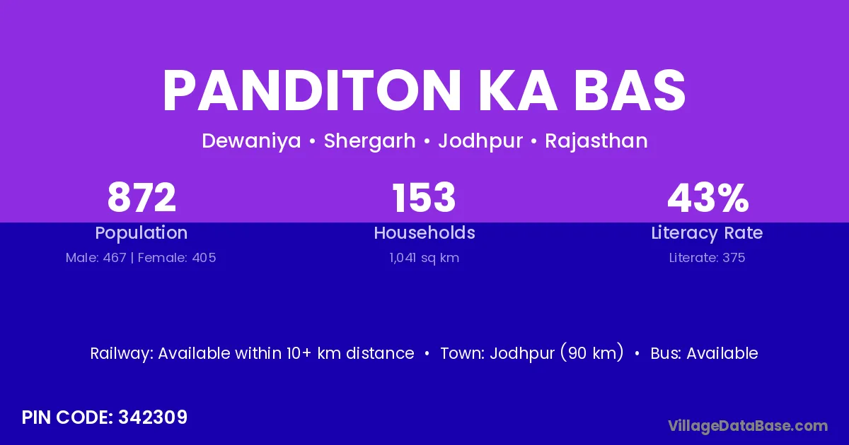 Panditon Ka Bas village has a total population of 872 people, of which 467 are males and 405 are females.