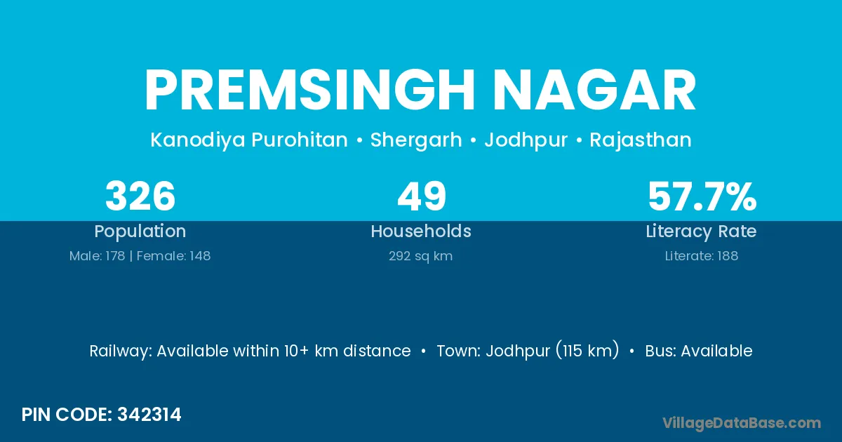 Jodhpur (115 km) is the nearest town to Premsingh Nagar village for major economic activities and is located approximately 115 km away.