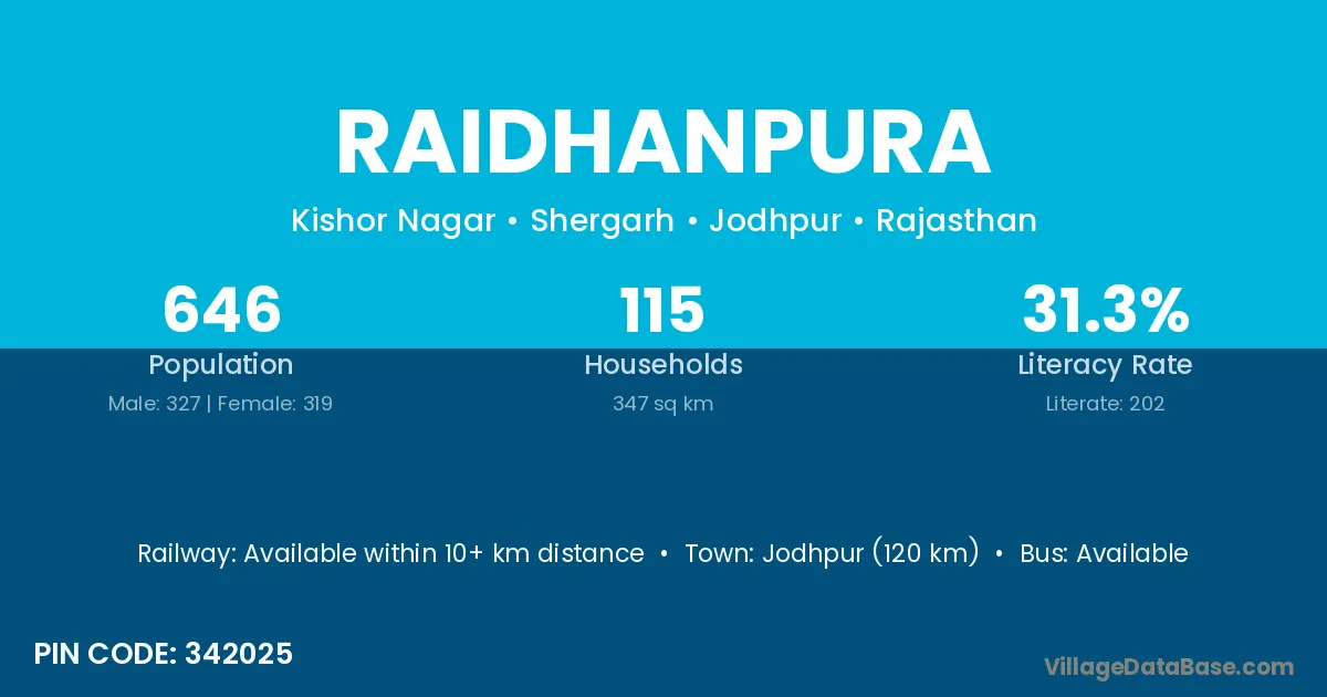 Jodhpur (120 km) is the nearest town to Raidhanpura village for major economic activities and is located approximately 120 km away.