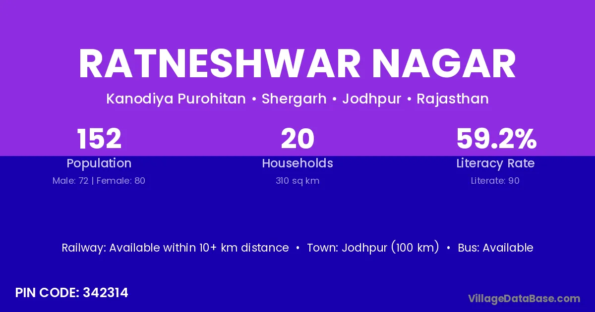 Jodhpur (100 km) is the nearest town to Ratneshwar Nagar village for major economic activities and is located approximately 100 km away.