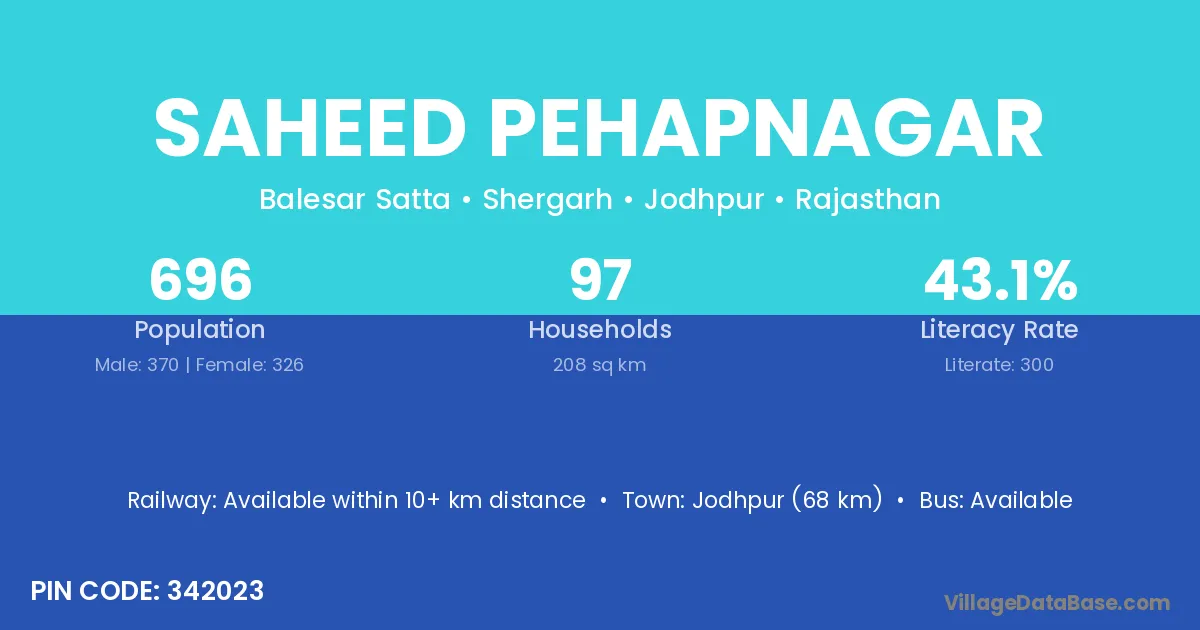 Jodhpur (68 km) is the nearest town to Saheed Pehapnagar village for major economic activities and is located approximately 68 km away.