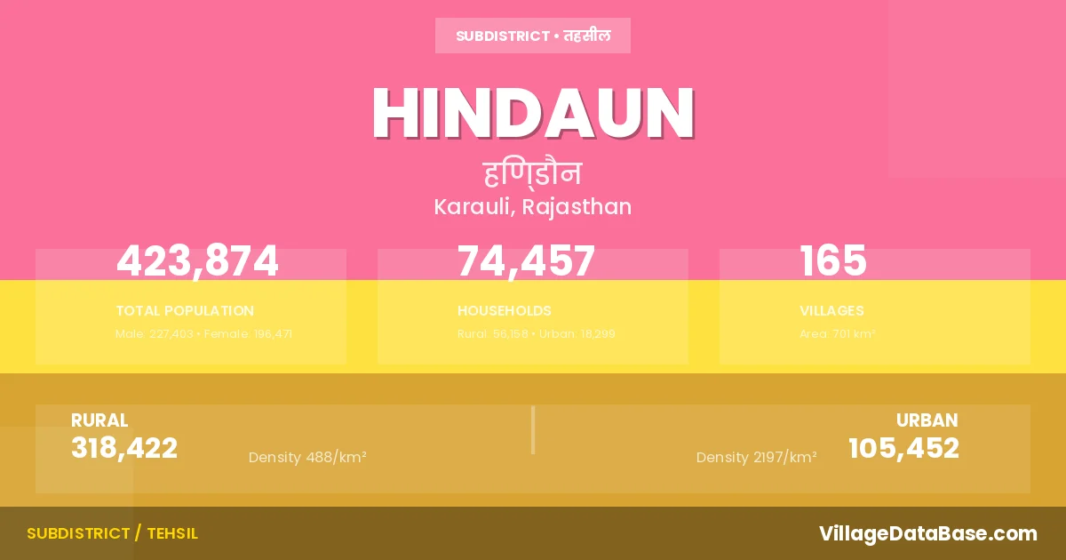 According to the 2011 census The total area of Hindaun Tehsil is 701 km², with a population of 423874 people. The population density is 605 inhabitants per square kilometre, and there are approximately 74457 houses in the sub district.