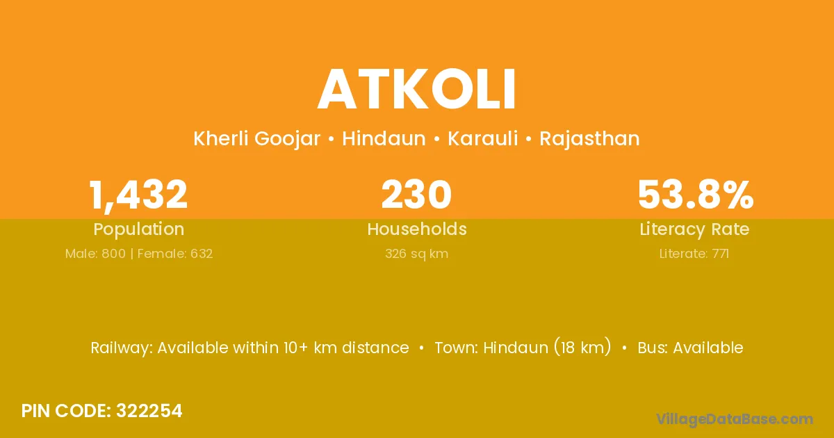 Hindaun (18 km) is the nearest town to Atkoli village for major economic activities and is located approximately 18 km away.