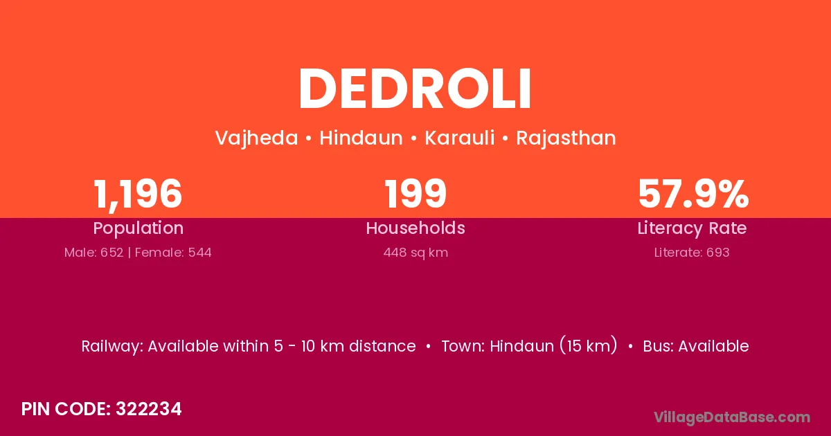 Hindaun (15 km) is the nearest town to Dedroli village for major economic activities and is located approximately 15 km away.