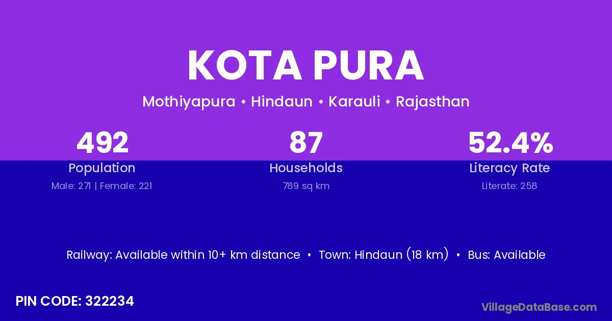 Hindaun (18 km) is the nearest town to Kota Pura village for major economic activities and is located approximately 18 km away.