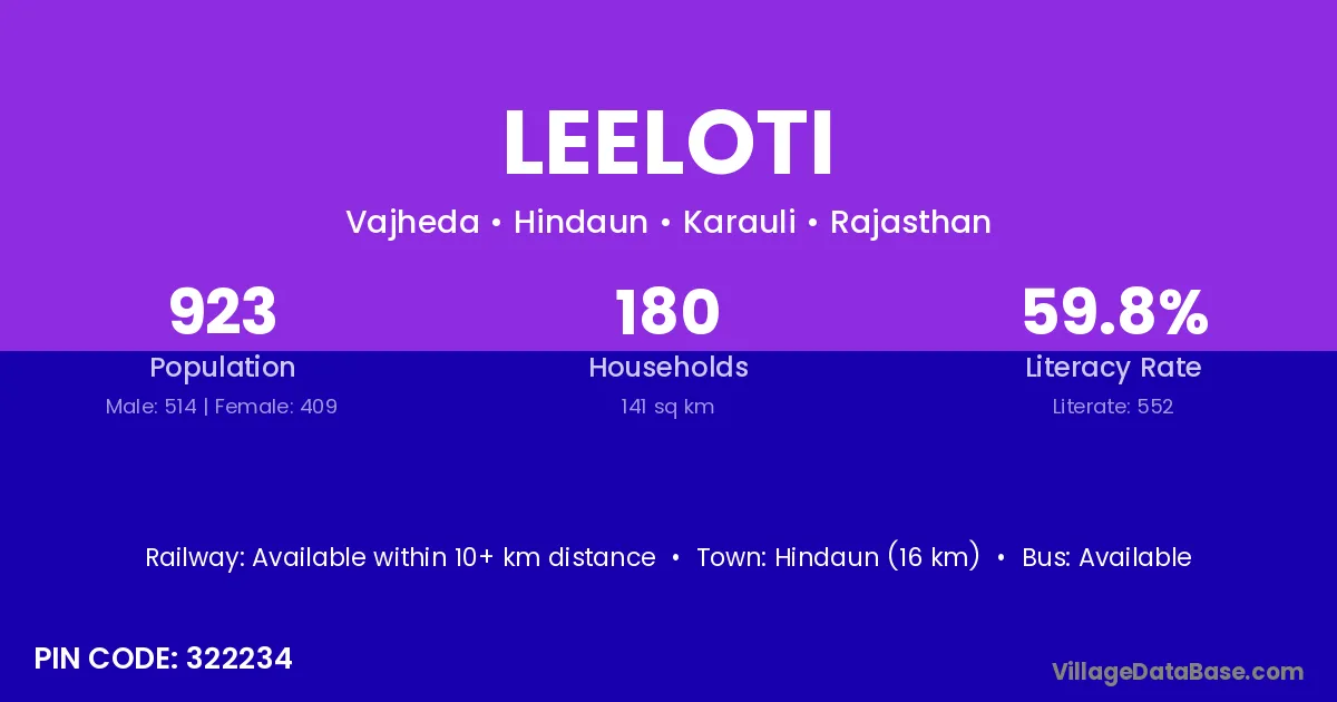 Hindaun (16 km) is the nearest town to Leeloti village for major economic activities and is located approximately 16 km away.
