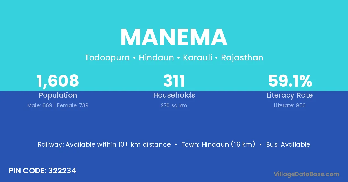 Hindaun (16 km) is the nearest town to Manema village for major economic activities and is located approximately 16 km away.
