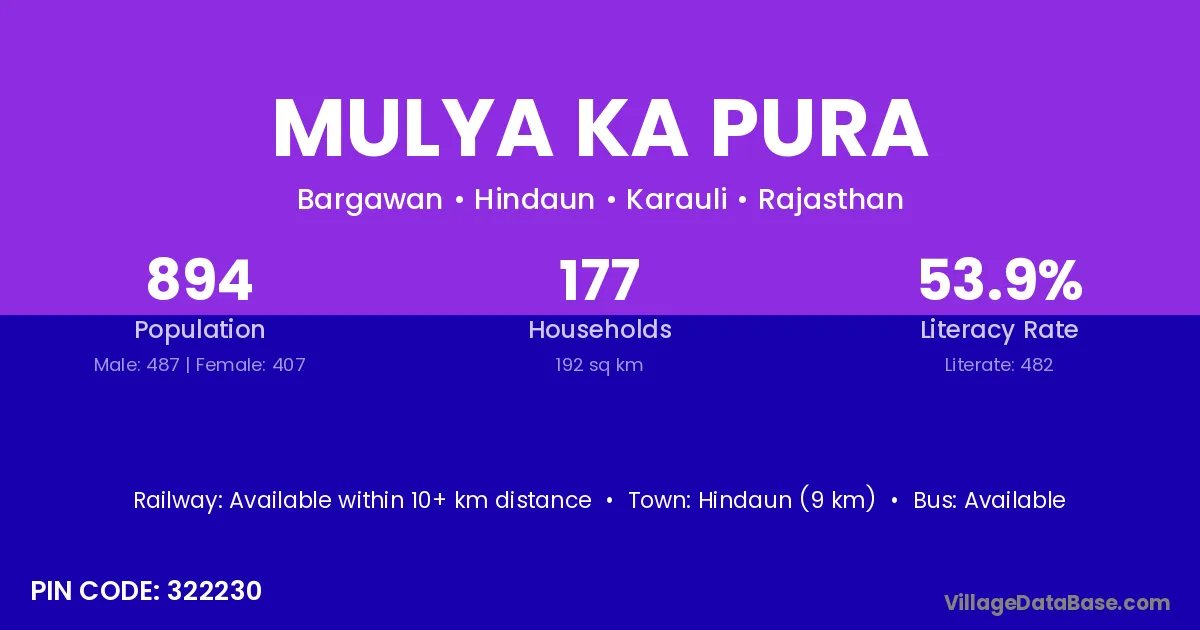 Hindaun (9 km) is the nearest town to Mulya Ka Pura village for major economic activities and is located approximately 9 km away.