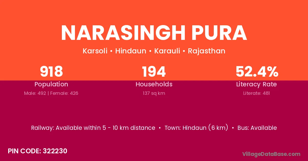 Hindaun (6 km) is the nearest town to Narasingh Pura village for major economic activities and is located approximately 6 km away.
