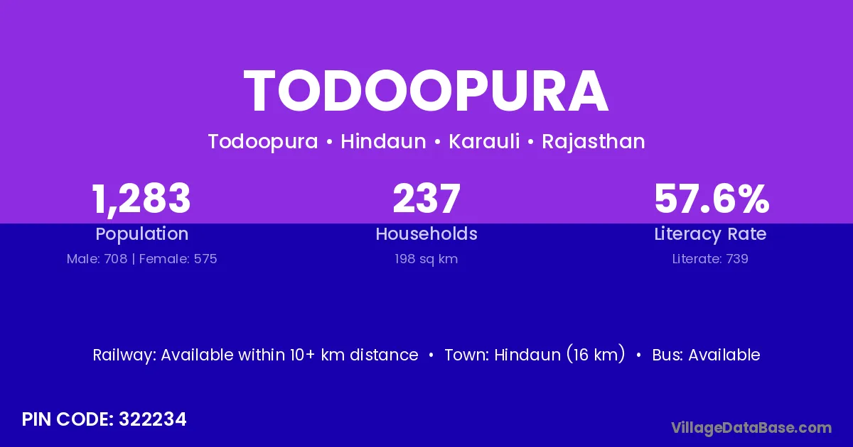 Hindaun (16 km) is the nearest town to Todoopura village for major economic activities and is located approximately 16 km away.