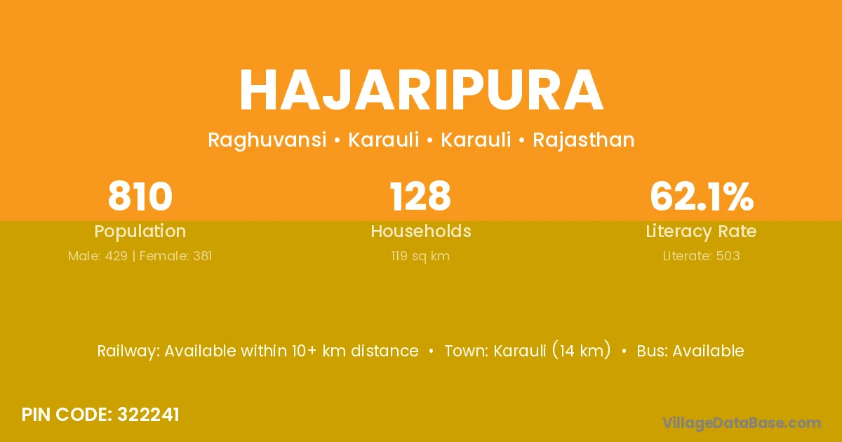 Karauli (14 km) is the nearest town to Hajaripura village for major economic activities and is located approximately 14 km away.