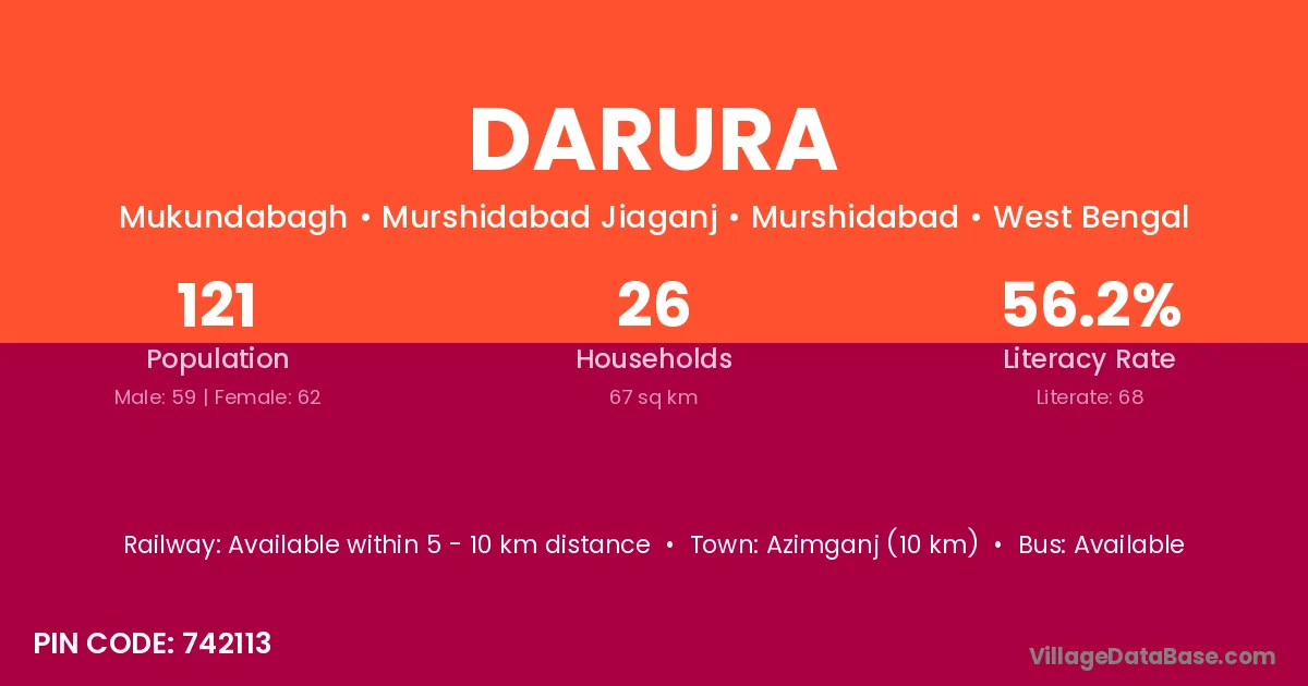 The literacy rate of Darura village is 39.44%. Male literacy stands at 51.76% and female literacy at 21.05%.