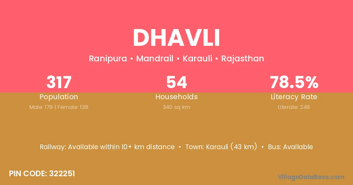 Karauli (43 km) is the nearest town to Dhavli village for major economic activities and is located approximately 43 km away.