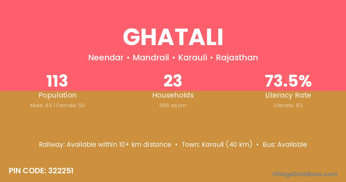 Karauli (40 km) is the nearest town to Ghatali village for major economic activities and is located approximately 40 km away.