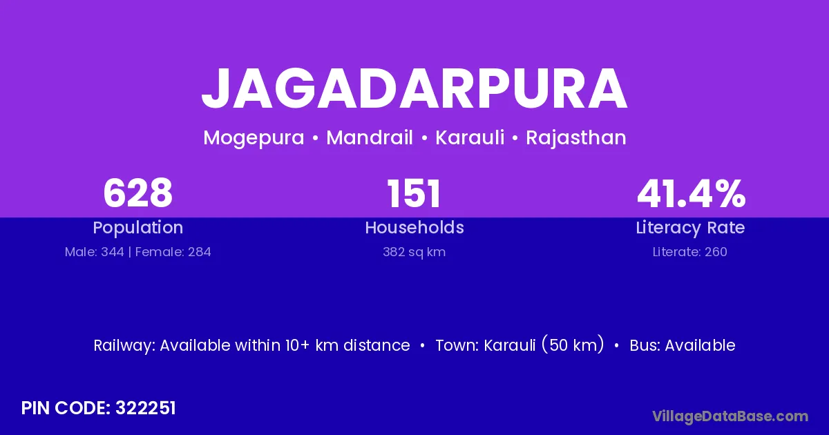 Karauli (50 km) is the nearest town to Jagadarpura village for major economic activities and is located approximately 50 km away.