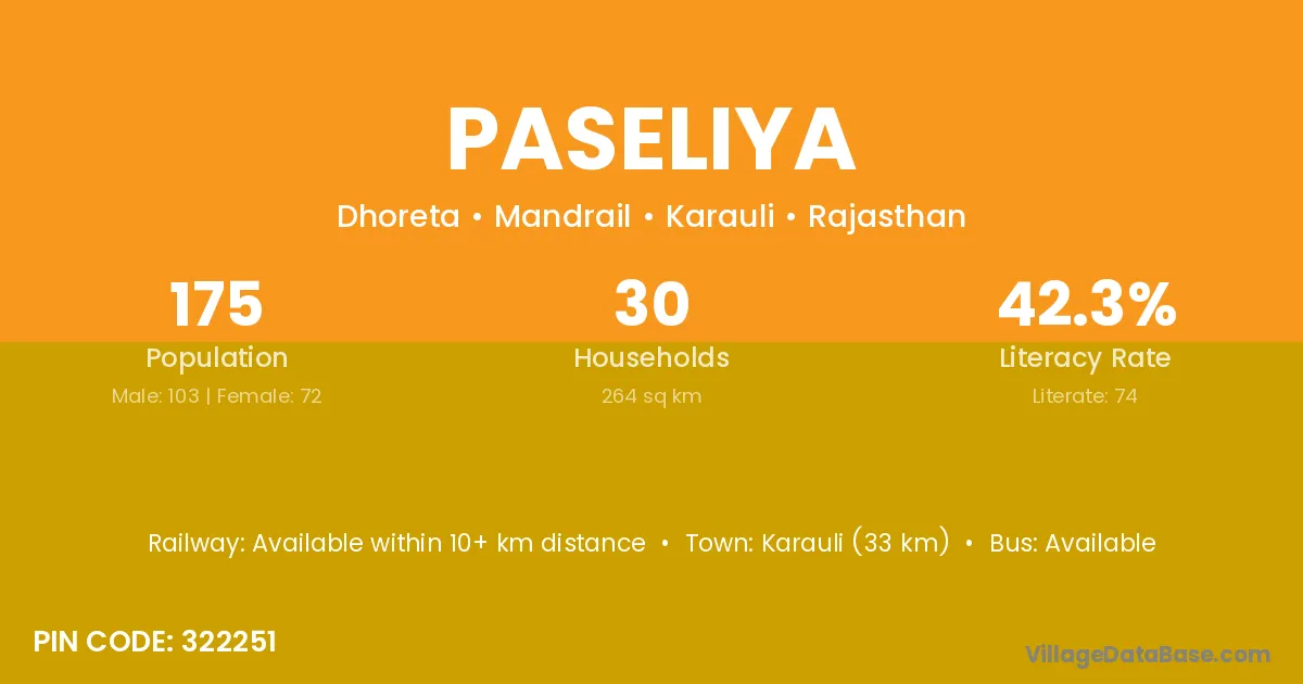 Karauli (33 km) is the nearest town to Paseliya village for major economic activities and is located approximately 33 km away.