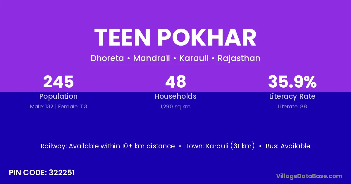 Karauli (31 km) is the nearest town to Teen Pokhar village for major economic activities and is located approximately 31 km away.
