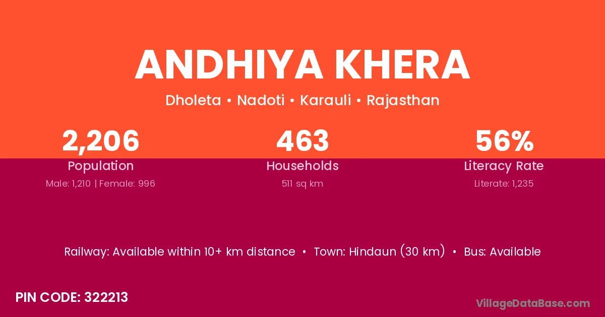 Hindaun (30 km) is the nearest town to Andhiya Khera village for major economic activities and is located approximately 30 km away.