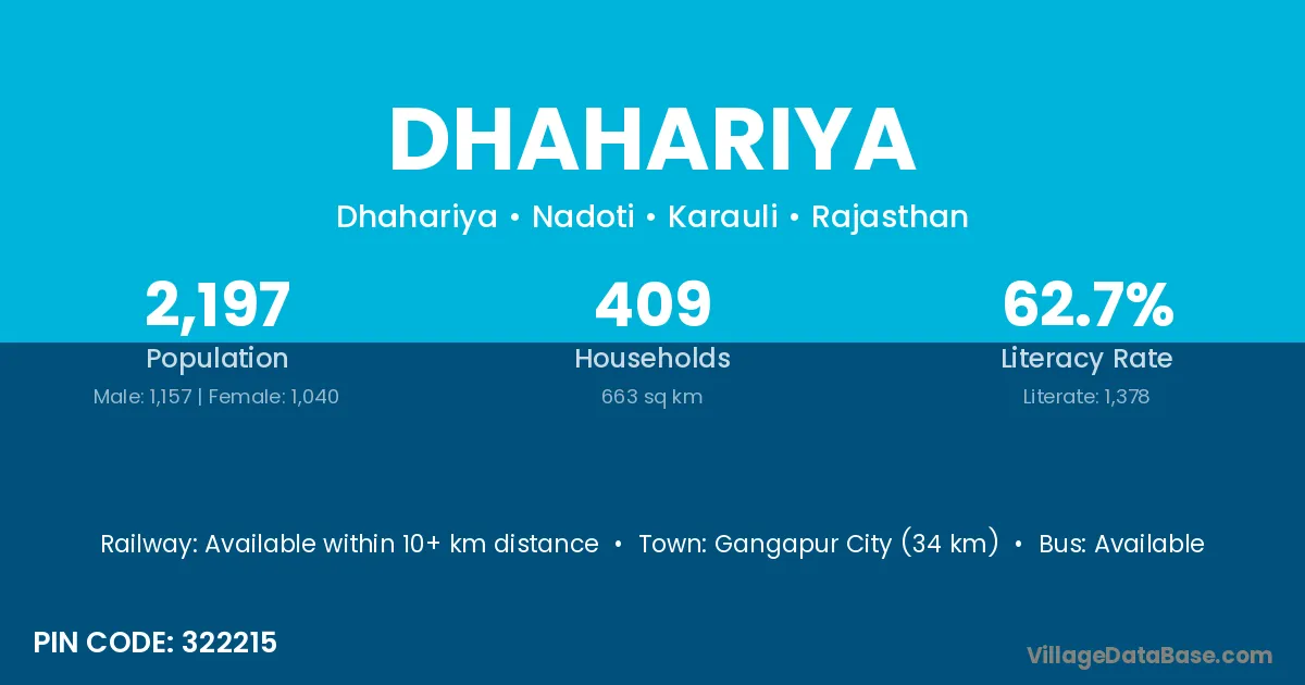 Gangapur City (34 km) is the nearest town to Dhahariya village for major economic activities and is located approximately 34 km away.