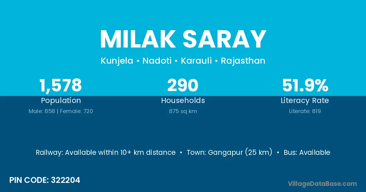 Gangapur (25 km) is the nearest town to Milak Saray village for major economic activities and is located approximately 25 km away.