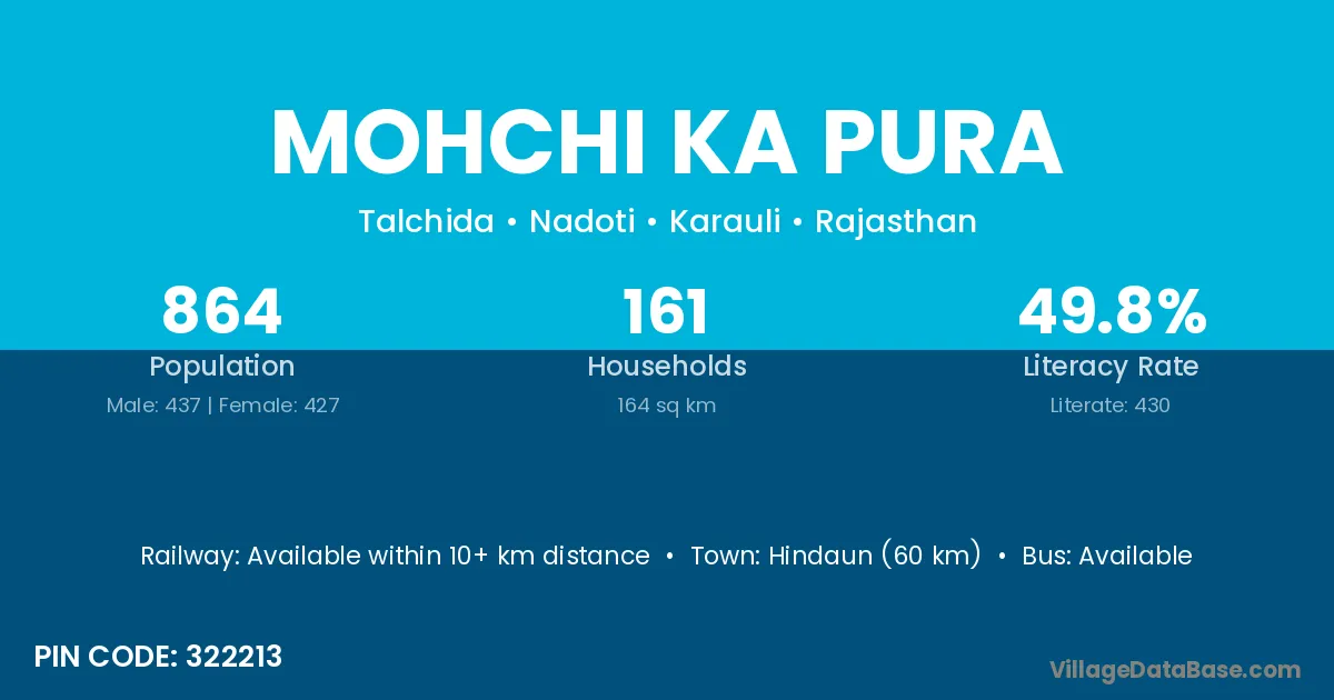 Hindaun (60 km) is the nearest town to Mohchi Ka Pura village for major economic activities and is located approximately 60 km away.