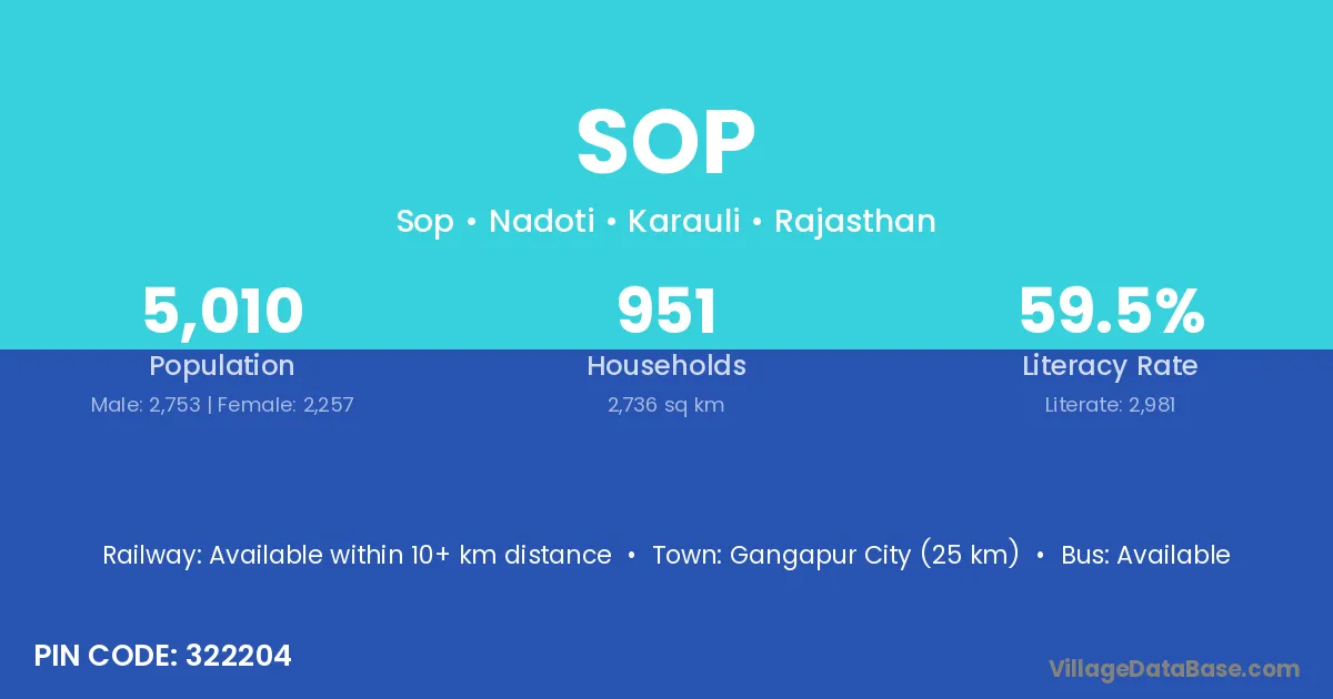 Gangapur City (25 km) is the nearest town to Sop village for major economic activities and is located approximately 25 km away.
