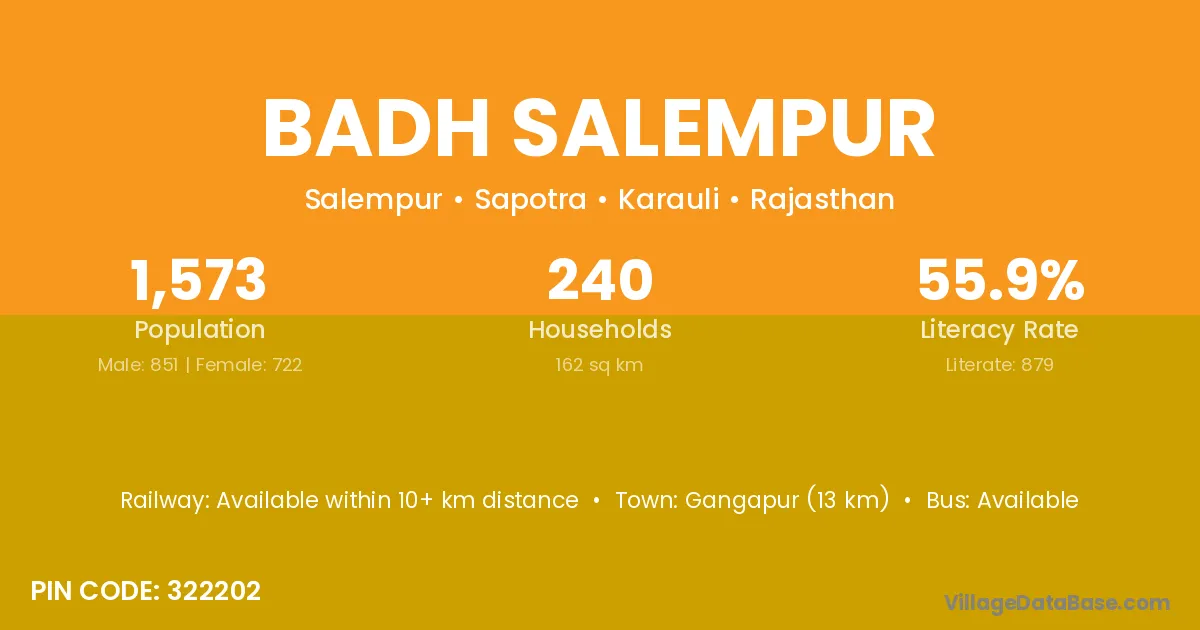 Badh Salempur village has a total population of 1,573 people, of which 851 are males and 722 are females.