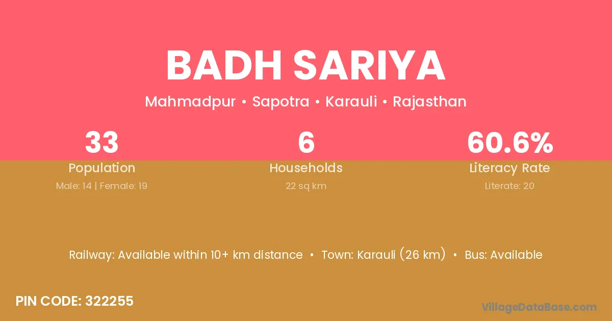 Karauli (26 km) is the nearest town to Badh Sariya village for major economic activities and is located approximately 26 km away.