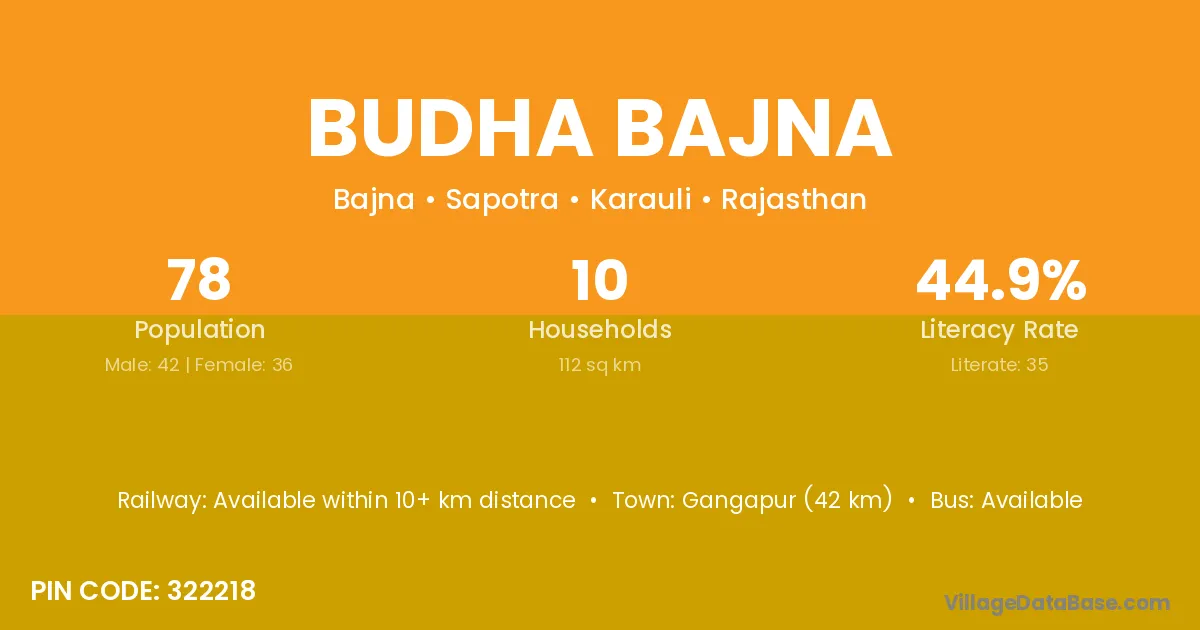 Gangapur (42 km) is the nearest town to Budha Bajna village for major economic activities and is located approximately 42 km away.