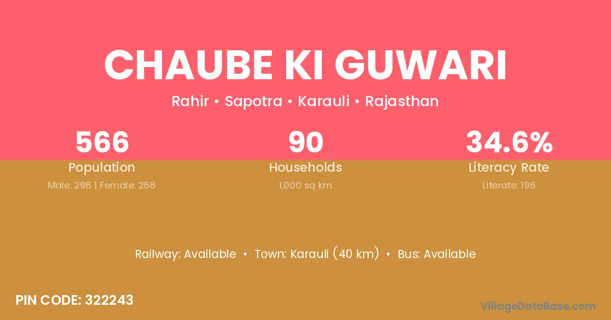 Karauli (40 km) is the nearest town to Chaube Ki Guwari village for major economic activities and is located approximately 40 km away.