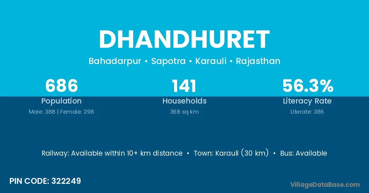 Karauli (30 km) is the nearest town to Dhandhuret village for major economic activities and is located approximately 30 km away.