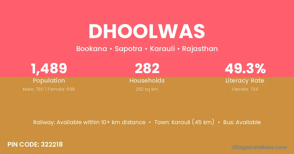 According to Census 2011 information, the village code of Dhoolwas village is 322218.
