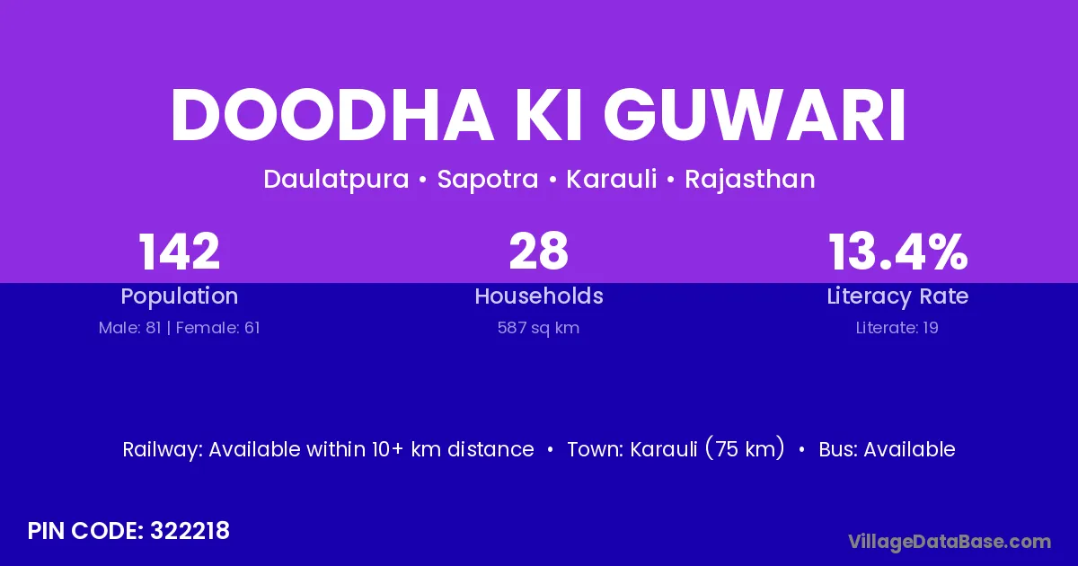 Doodha Ki Guwari village has a total population of 142 people, of which 81 are males and 61 are females.