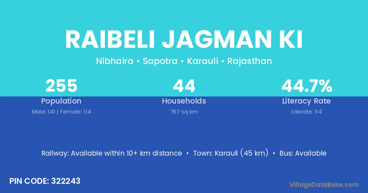 Karauli (45 km) is the nearest town to Raibeli Jagman Ki village for major economic activities and is located approximately 45 km away.