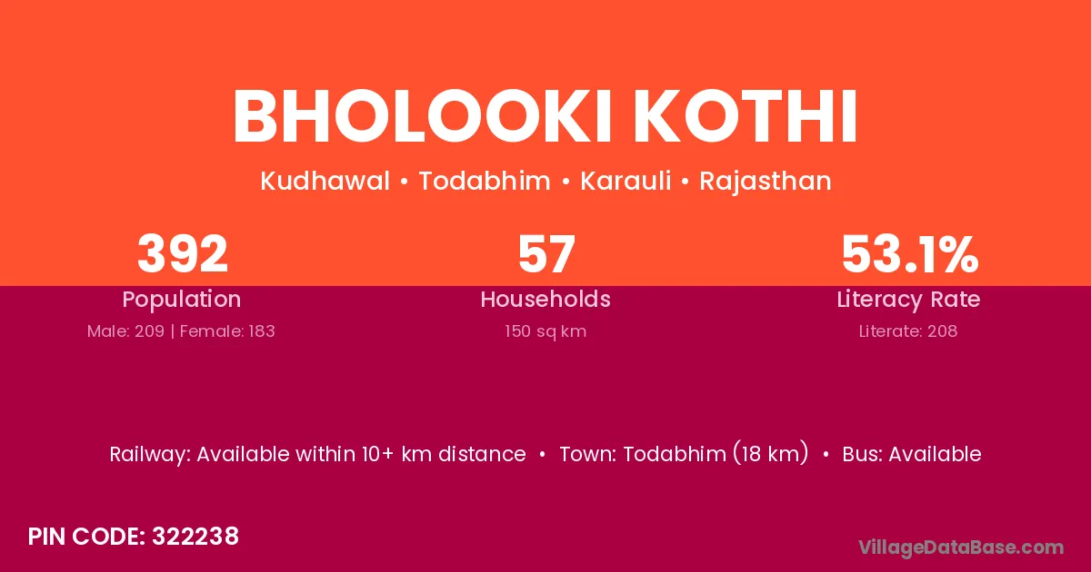 Bholooki Kothi village has a total population of 392 people, of which 209 are males and 183 are females.