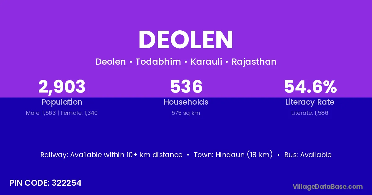 Hindaun (18 km) is the nearest town to Deolen village for major economic activities and is located approximately 18 km away.