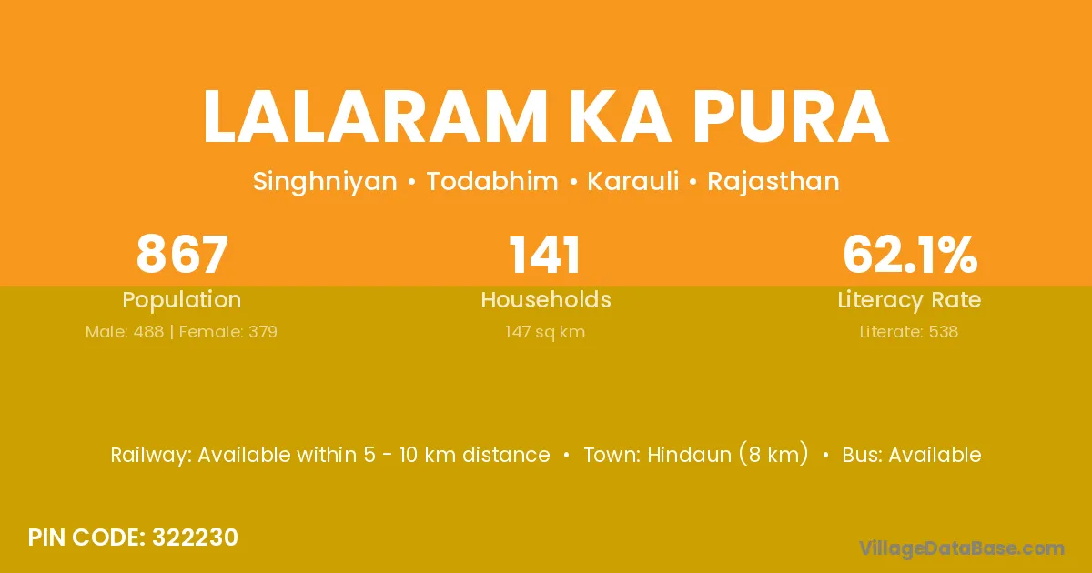 Lalaram Ka Pura village has a total population of 867 people, of which 488 are males and 379 are females.
