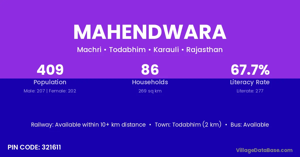 Todabhim (2 km) is the nearest town to Mahendwara village for major economic activities and is located approximately 2 km away.