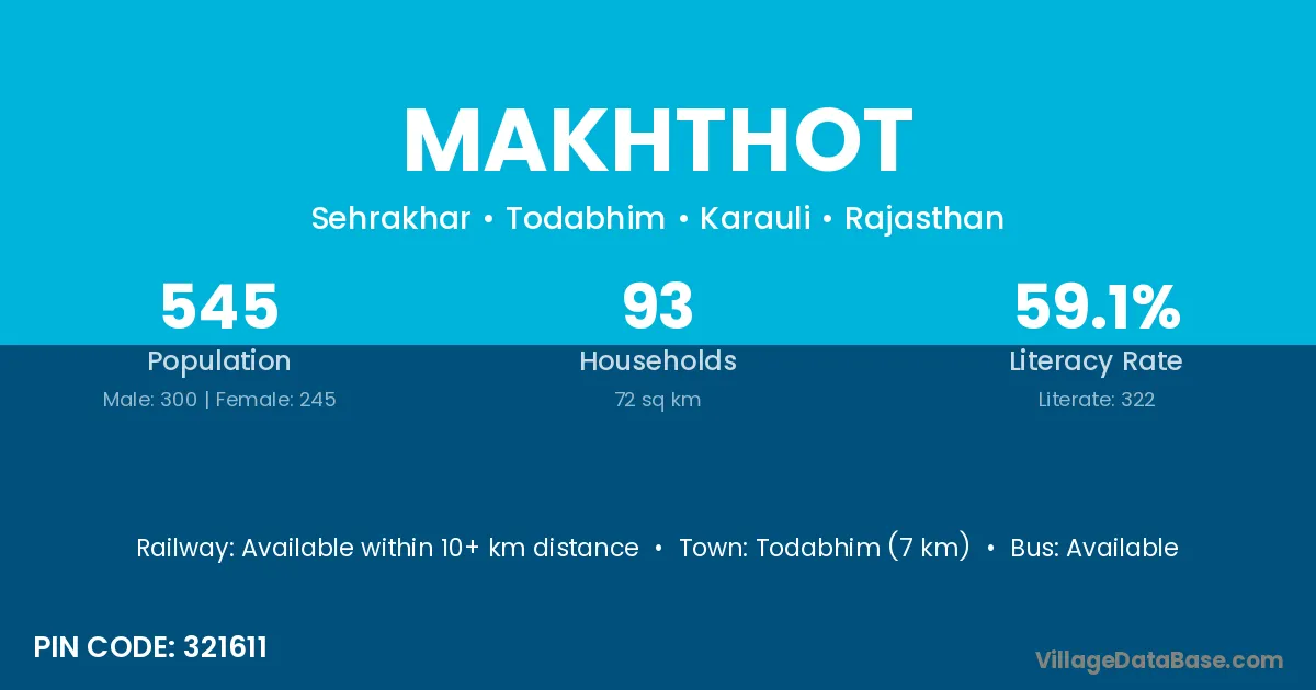 Todabhim (7 km) is the nearest town to Makhthot village for major economic activities and is located approximately 7 km away.