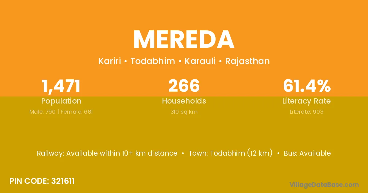 Todabhim (12 km) is the nearest town to Mereda village for major economic activities and is located approximately 12 km away.