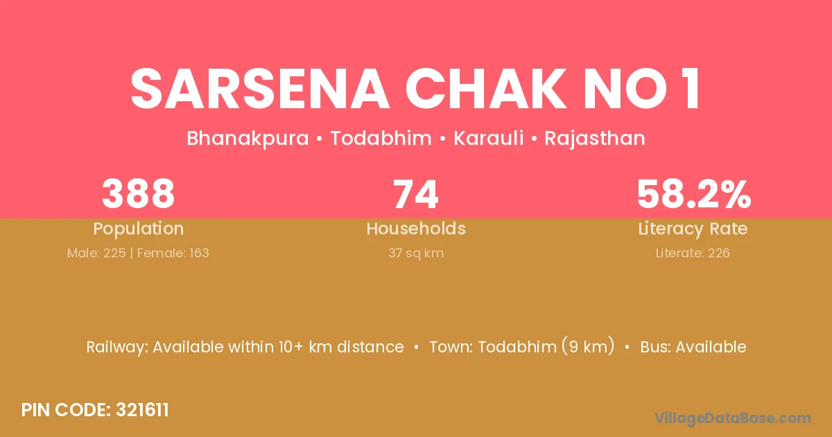 Todabhim (9 km) is the nearest town to Sarsena Chak No 1 village for major economic activities and is located approximately 9 km away.